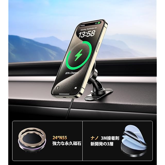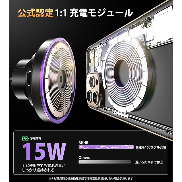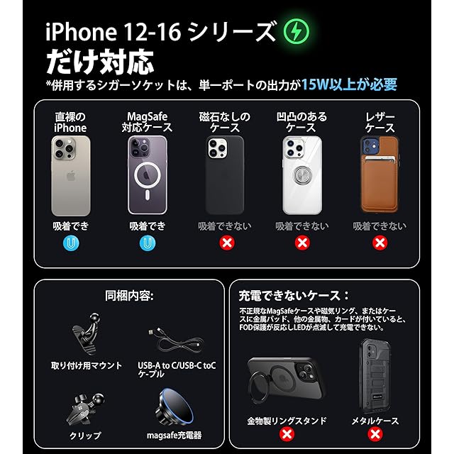 【急速充電magsafe車載充電器】インテリジェントな熱管理により、純正のMagSafe充電器とほぼ同じなスピードを実現。急速充電には18W以上のQCアダプターが必要(アダプターは別売り)。この車載マグセーフ充電器は、iPhone17/16/15/14/13/12シリーズに対応します。ご注意:iPhone12以前の機種の場合、本体に吸着できるマグネット部分がないため、本製品はご使用いただけません。※ 重要:i Faceケースには対応できないです!