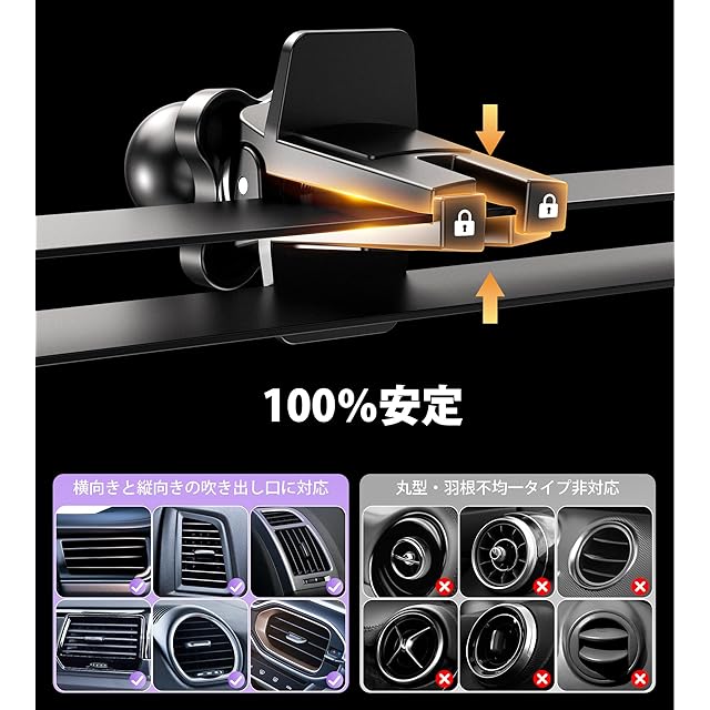 【頑丈なエアベントクリップ】強力なエアベントクリップと固定アームにより、デコボコの道でもしっかりと固定でき、安定性を向上させます。ほとんどの横及び縦の出口と互換性があります。ご注意: 円形の出口に対応しません。