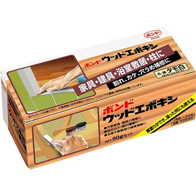 2液混合型、耐水性、補修部肉やせなし、切削可、塗装可(オイルステイン(木材保護塗料)、ニスを除く)