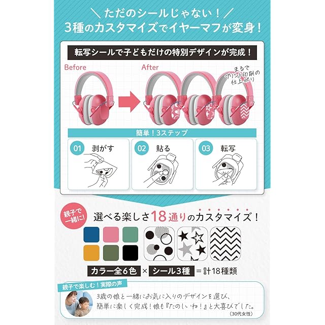✅【カスタマイズ転写シール付】まるでプリントのように仕上がる転写シール(3種類)が付属しているので、子供の好みに合わせて自由にカスタマイズできるイヤーマフです。
