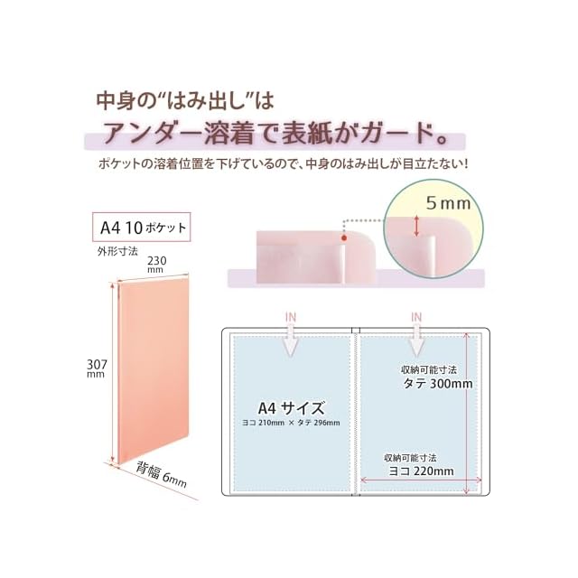 ポケット内寸:縦299mm×横220mm。A4サイズ(縦297mm×横210mm)向けポケットファイル。中紙無しのポケット10枚。書類の簡易保管に便利。