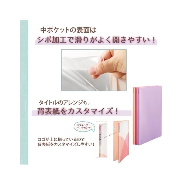 ポケットに工夫:フィルムのエンボスが従来より強く、ポケットが開きやすくなりました。また、中ポケットが表紙より5mm下がっているので、書類がはみ出しても表紙で保護します。