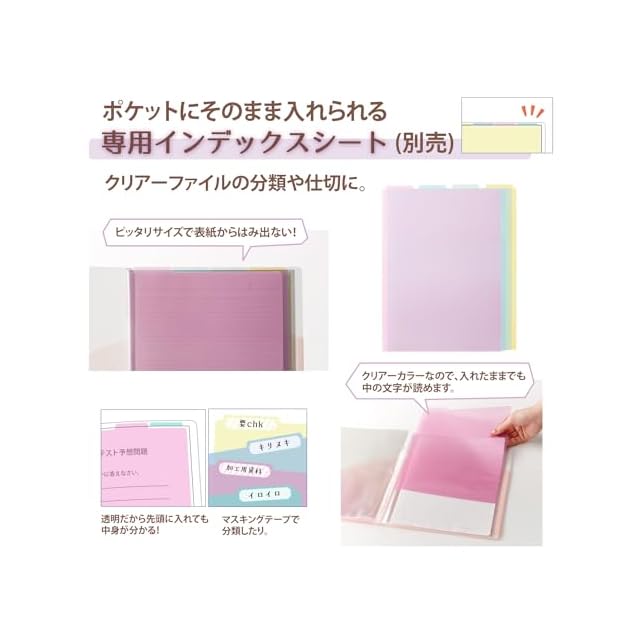ポケット内寸:縦299mm×横220mm。A4サイズ(縦297mm×横210mm)向けポケットファイル。中紙無しのポケット20枚。書類の簡易保管に便利。
