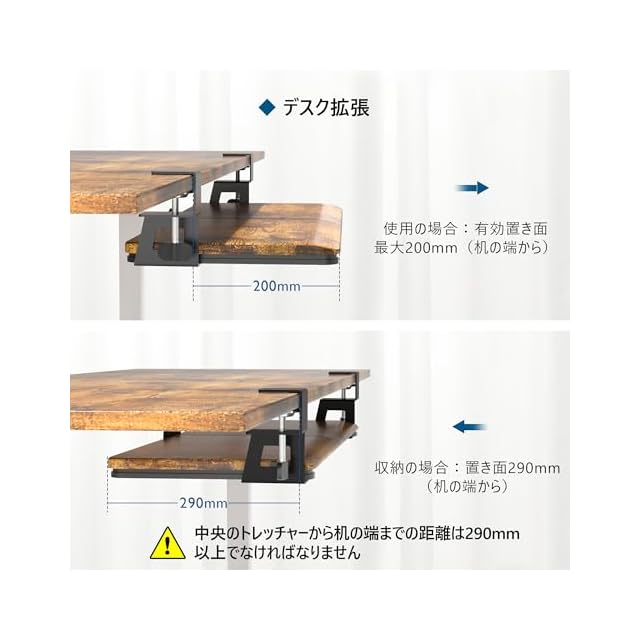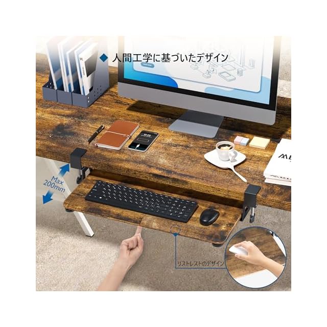 【スムーズなスライドと収納】高品質なトラックシステムにより、キーボードトレイがスムーズにスライドし、使わないときはデスク下に簡単に収納できます。キーボードトレイはデスクの端から最大 200mm 伸びます。キーボード 台としても優れており、オフィスや家庭での作業効率を向上させます。''',
