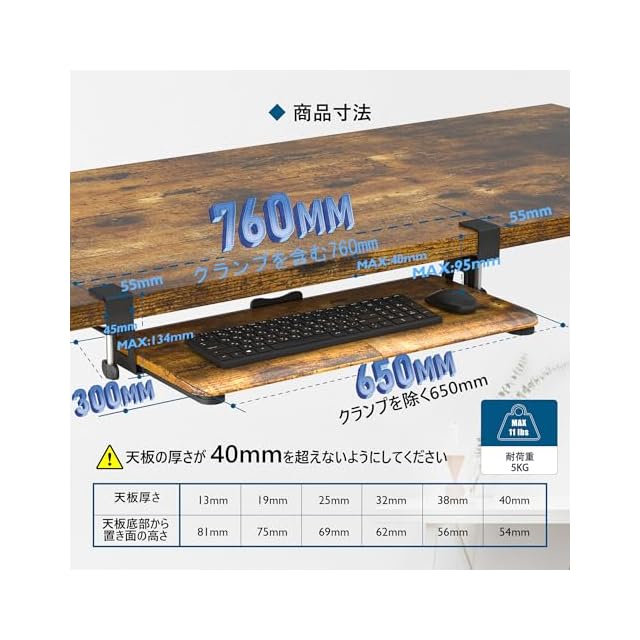 【広々とした作業スペース】ご注意: 左クランプから右クランプまでの全幅は760mmですので、購入前に製品の寸法と机の適合性を確認してください!!!幅650mm (クランプを含めて 760mm) × 奥行300mmx×高さ134mmのキーボードトレイはキーボードとマウスを一緒に収納できる広々とした作業スペースを提供します。最大耐荷重5kgで、安定性と耐久性に優れています。