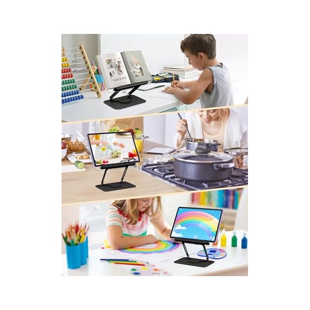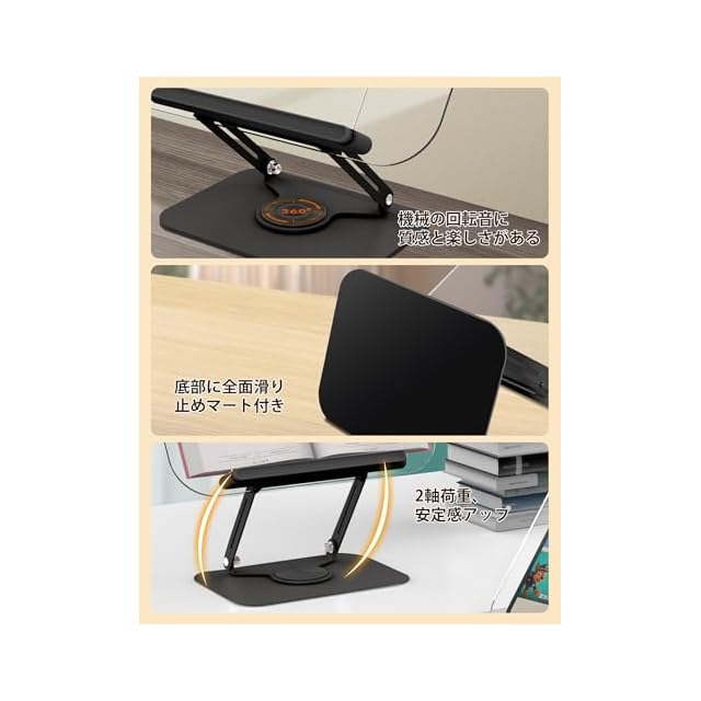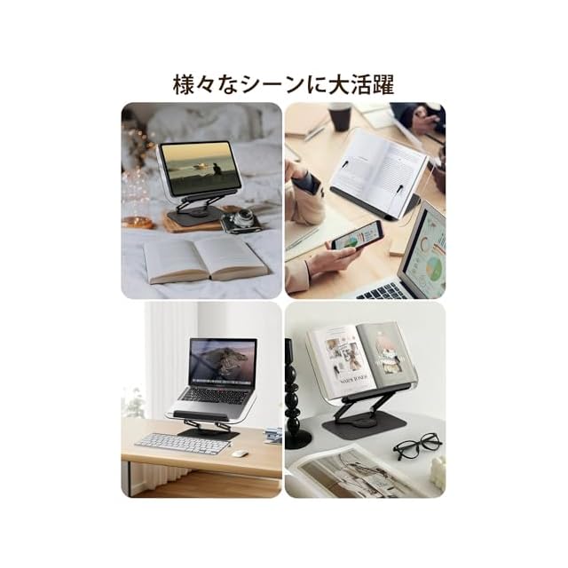 【360度回転可能】卓上スタンドは台座部分が回転するので、見やすい向きに簡単に調整できます。タブレットスタンドやPCスタンドとして使う時、回転させて相手の見やすい向きに画面を共有できるので、オフィスでの資料の表示や説明、会議やプレゼンテーション、在宅デスク作業、オンライン教育などに最適です