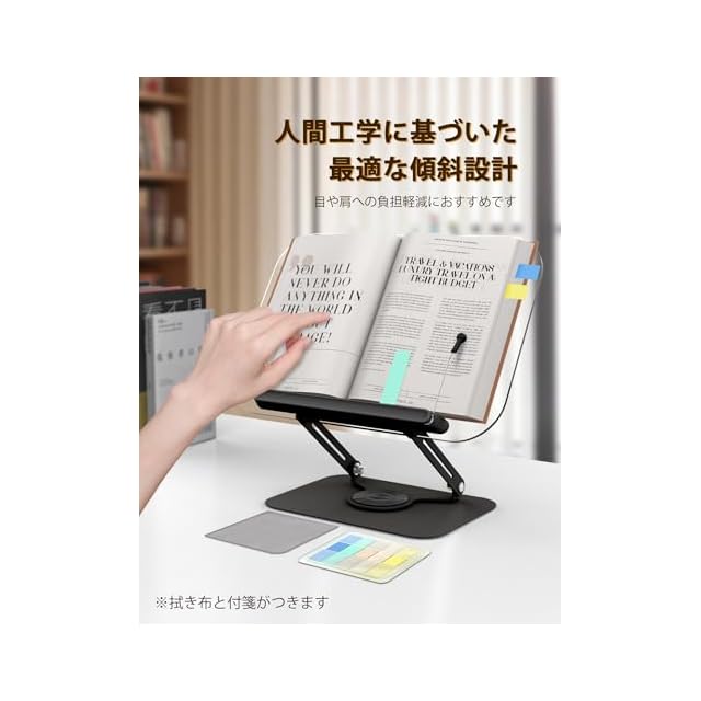 【無段階高さ調整】人間工学に基づいて設計により、本読み時、角度・高度を無段階調整可能で自分に最適な高度まで調整できる書見台!6.5~18.5cmまでお好みの高さ自由に調節により、0~180度の自由な角度調整により、最適な視野を実現し。本を目線と同じの高さにすることで姿勢を改善することだけではなく、目や肩への負担軽減、猫背対策などにもおすすめです。自宅でのリモートワークや長時間勉強や読書でも、健康的な姿勢を保ち、能率を高めます