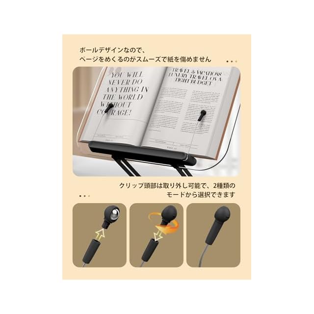 【製品詳細】プレート寸法:34*23.5cm、重さ:1.6kg、耐荷重:3kg、ブックホルダーの厚さ:0~7cm。教科書、料理本、レシピ、楽譜、雑誌、文庫本、新書本、漫画単行本、3.5~15インチ携帯、タブレット、電子書籍リーダーなど、さまざまな本やデバイスに配置できます。取り付け不要で、保護フィルムと拭き布と付箋と関節調整用ボックスレンチも付き