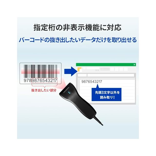【指定桁の非表示機能に対応】特定文字の非表示機能に対応しました。 指定した桁のスキャンデータを非表示することができるので、バーコードの抜き出したいデータだけを取り出せます。