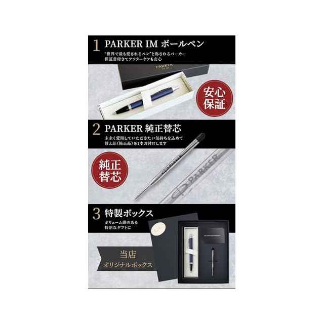 [セット内容] 1.PARKER IMCTボールペン 2.PARKER純正替芯(M1.0mm) 3.プロモーションカード 4.特製ボックス 5.ギフトバッグ 6.書(ボールペンボックスの内底にございます)