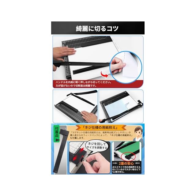 ✅【ネジ仕様の用紙押さえ付き】「裁断時は紙ズレしやすい」の購入者からのフィードバックによって、用紙の位置を調整してするために便利な「ネジ仕様の用紙押さえ付き」も付属します。ネジを回してバテンを動かす、用紙を指定のサイズに裁断するのに固定用便利なガイド付いているので大きい紙などでも安心。裁断時の紙ズレを防ぎ、指が刃に当たらない安全設計のスプリングセミオート方式紙押さえ付き(スプリング機構)、上刃と連動して動き、紙をしっかり固定!裁断後は付属のスプリングで、上刃・アームが自動的に上がります。ネジ仕様の押さえと、カッターと同時に動く押さえ付きでダブルの強力ストッパー!