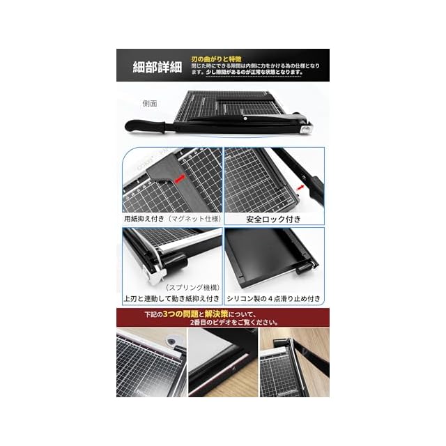 ✅【安全ロック付・目盛り入り】未使用時に上刃が開かないよう、ハンドルを固定できる安全ロック機構付ので安心です。ブレードストッパーや滑り止め付で安全面もばっちりです。グリップも握りやすいです。カッティング台には、5つ「サイズ設定定規:B7/B6/A5/B5/A4」の用紙サイズ表示に加え、用紙を裁断する際に便利な1cm単位の目盛り付きで正確なカットが可能。一目でサイズを把握できます。 ※本製品はカーブ刃を採用しているため刃を閉じた際にカッティング台との間に隙間が生じますが、仕様ですので問題有りません。 ※閉じた時にできる隙間は内側に力をかける為の仕様となります。少し隙間があるのが正常な状態となります。 ※製造過程において、サビ防止などのため、刃に油がついております。ご使用前に、手に気をつけて刃の油を拭き取って下さい。