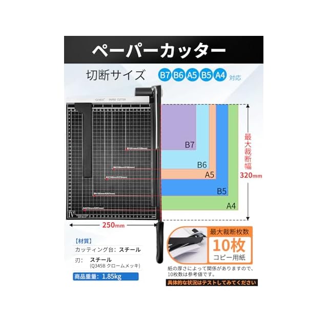✅【ペーパーカッター A4サイズ】「マグネット仕様の用紙抑えは、裁断時は紙ズレしやすい」の購入者からのフィードバックによって、「ネジ仕様の用紙抑え」も付属します。 切断サイズ:B7/B6/A5/B5/A4対応 カット可能サイズ:320×250mm 最大裁断枚数:コピー用紙 12枚まで 資料や用紙の裁断、事務作業などにとっても便利です。コピー用紙、種類などの直線裁断用、最大 A4サイズまでの用紙の重ね切りが楽にできます。硬めの紙の場合はやや少なくなります。