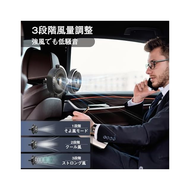 【超静音運転】ノイズレスブラシレスモーターを採用した車載扇風機は、運転時の騒音を38dB(1段階風速)まで低減。同類製品比50%の静音性を実現しました。夜間の運転中や乗客の休息時でも、ナビゲーションの音声や車内会話を邪魔することなく、静かで快適な車内環境を提供。従来の車用扇風機の煩わしい「ブーン」という音とはお別れです