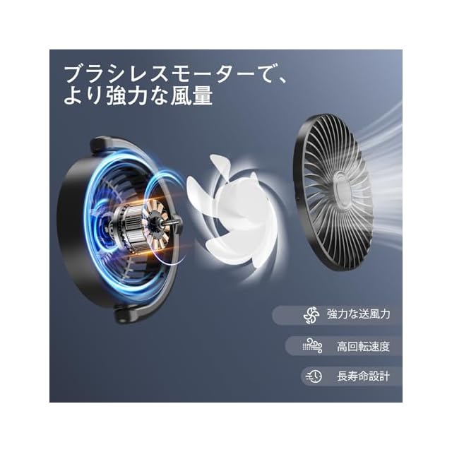 【3段階風量調節機能】弱/中/強の3モードをワンタッチ切替え。微風モードでは深夜ドライブや休憩時にも頭痛を引き起こさない穏やかな送風を持続。ターボモードでは車内の熱気を即座に冷却します。ブラシレスモーターと航空力学に基づいた特殊ファンブレードの組み合わせで、従来の車座席ファン比40%高い送風効率を実現。車載扇風機の新基準となるパフォーマンスです