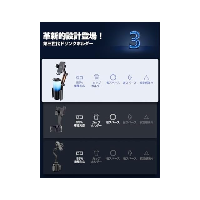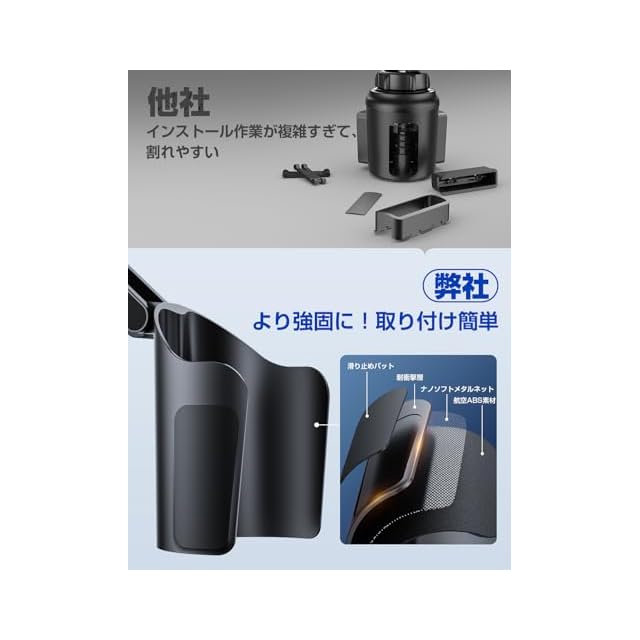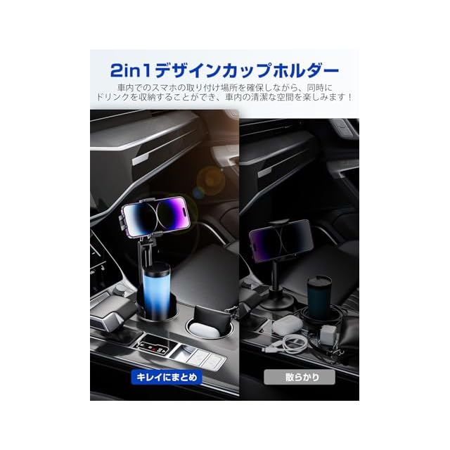 【破格の思い2in1ドリンクホルダー運転環境を快適に】 弊社より独自開発されたドリンクホルダーとスマホホルダーが一体化した革新的アイテム、「2in1ドリンクホルダー&スマホホルダー」日本に初登場します。カップホルダーとしてもスマートフォンホルダーとしてもお使いいただけます。安定したクリアなナビゲーションサービスを車の運転中に楽しむと同時に、中空の台座にカップ、はボトル、鍵、財布などを収納することができます。「あふれごちゃごちゃして」「毎日のように探し物を」「置き場所が足りない」といった問題を完全に解決します。ご家族やご友人とのドライブも、これ一台でストレスフリーに、限られた車内空間を有効活用して快適なカーライフを送りましょう。
