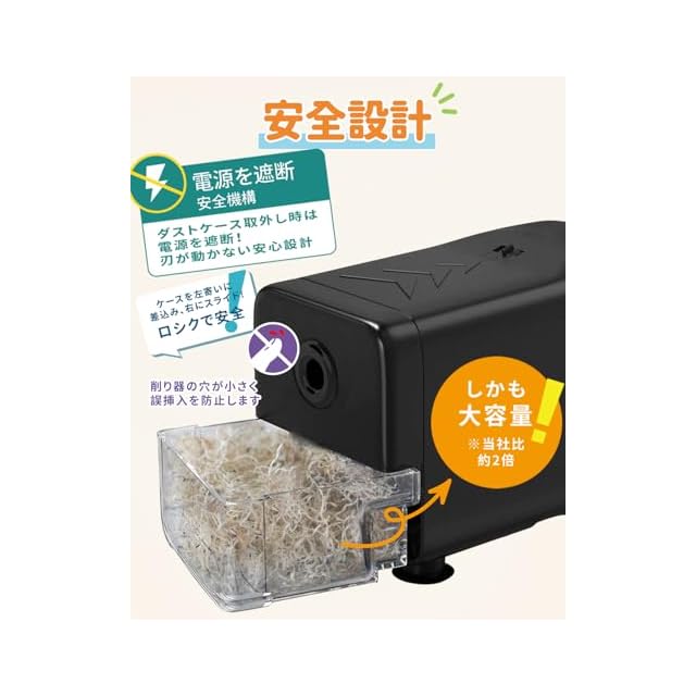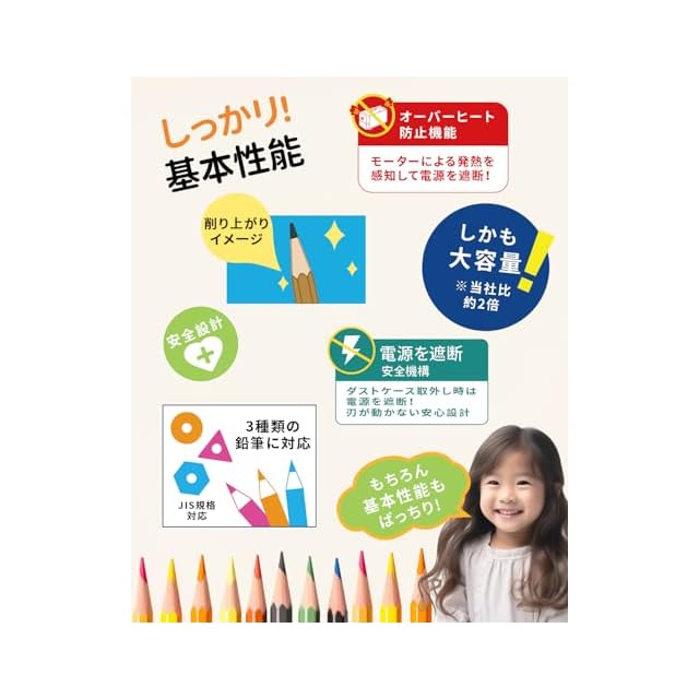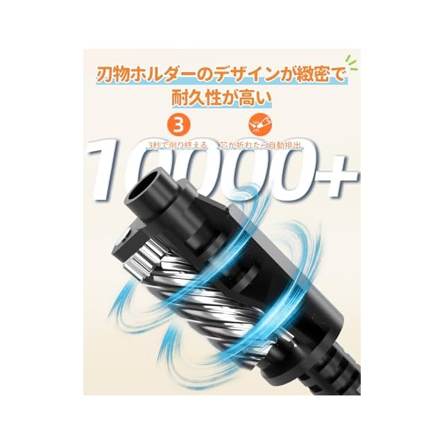 高品質の鉛筆削り----良質な螺旋刃を採用,削り回数は10000回に達して,非常に耐用。鉛筆削りは自動的に仕事をやめますので、安全性が確保できます。また,屑ボックスを開けたとき鉛筆削りは作業しない。あとは、過熱内装置があるため、壊す場合も少なくなります。学校、入園入学、事務用、オフィス、美術描きに適用します。それに、子供の入学お祝いにプレゼントとして、お勧めです。