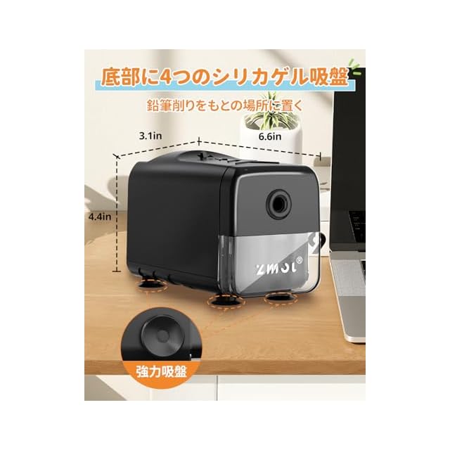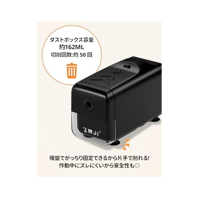 細いデザイン----この電動鉛筆削りは大容量の屑箱があります。削りくずを捨てる頻度も少なく、手間も軽減できます。それに、箱は透明で、削りカスがどれくらい溜まっているかは一目瞭然です。底に吸盤が4つありますので,鉛筆を削ることはもっと堅固にする。
