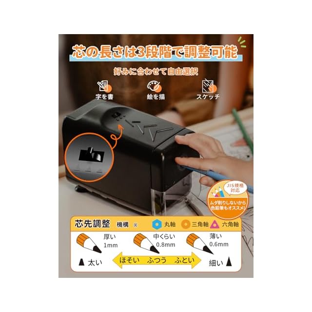 芯先太さ調節機能---- 芯先太さ調整スイッチで、「尖る」「ミディアム」「鈍い」の三段階に芯先の太さを調節することができる。 6.5~8mmの芯先の鉛筆・色鉛筆に対応する。この鉛筆削りは折芯除去機能付きます。内部で芯が折れたとき、折れた芯は自動的に排出する。