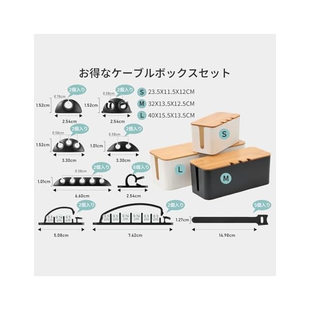 【商品詳細】材質:プラスチック&天然竹製 バッケージ内容:Sサイズのコードケース ブラック*1、Mサイズのコードボックス ブラック*1、ケーブル収束バンド*5、コードクリップ*20点。寸法:S (23.5x11.5x12cm)M (32x13.5x12.5cm)L (40x15.5x13.5cm) ※サイズの誤差は多少発生します。ご了承下さい。