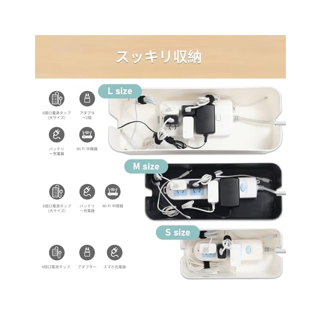 【商品詳細】材質:プラスチック&天然竹製 寸法:S (23.5x11.5x12cm)M (32x13.5x12.5cm)L (40x15.5x13.5cm) バッケージ:S/M/Lサイズのコードケース*1、ケーブル収束バンド*5、コードクリップ*20点(最大直径約7mmの各種ケーブルやコードに対応できます。)※サイズの誤差は多少発生します。ご了承下さい。