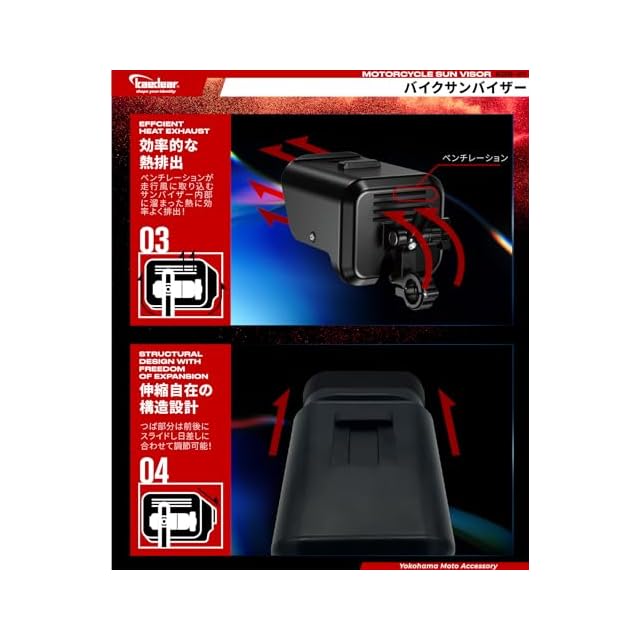 【スマホホルダー用サンバイザー】 カエディアユーザーがツィッターに集結し、夏は温度プロテクションでスマホが使えなくなる、バッテリー制御で充電されなくて困る、雨の日はタッチスクリーンが雨粒で操作できなくなって困る、だからスマホホルダー専用のサンシェードをカエディアで開発してほしいと多くの声が寄せられました。日ごろから愛用して下さるユーザーの期待に少しでも応えたい、その想いでツイッター上でユーザーの目の前で開発を行い完成しました。 バイザーを上下に動かせる構造、伸ばすことが出来るツバ、遮熱効果があるアルミ製シュラウド、排熱効果を高めるベンチレーションなど、ユーザー自身の拘りが詰まっています。