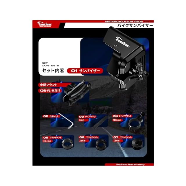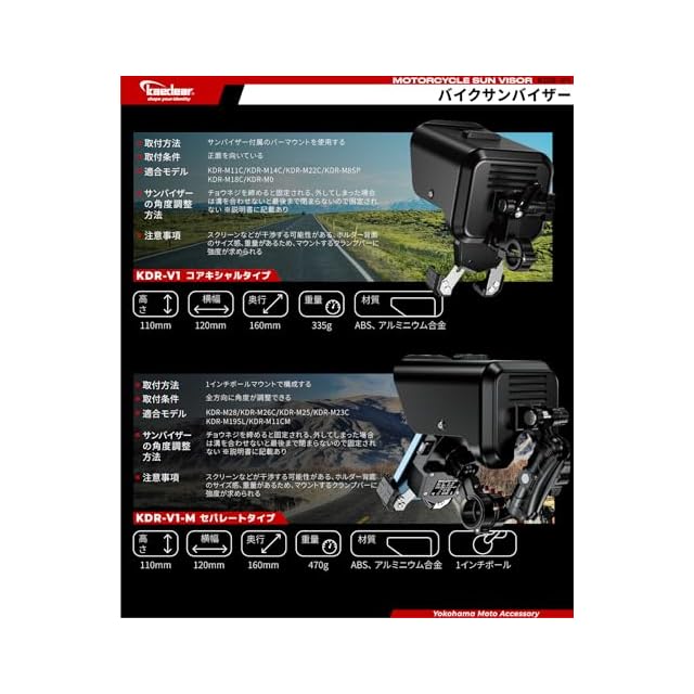 【商品詳細】 ■サイズ:高さ110mm、横幅120mm、奥行160mm(バイザー部分) ■材質:ABS、 アルミニウム合金 ■重量:KDR-V1/335g、KDR-V1-M/470g ■内容:KDR-V1/サンバイザー(ボルト固定)、17mmボールバーマウント(径32mm/貫通タイプ)、アタッチメント(12/22/25.4mm)、2mmラバーテープ、レール KDR-V1-M/サンバイザー(1インチボール)、1インチボールバーマウント(径32mm)、アタッチメント(12/22/25.4mm)、2mmラバーテープ、中間マウント90mm ■ご注意:⑴スマホホルダーは付属致しません。⑵スマホ機種や使用用途によっては効果を体感できない場合があります。⑶調整箇所が多く、DIYでの取り付け難易度が高く感じられる場合があります。⑷車種特有のハンドル周りの条件等により取り付けが難しい場合があります。車種特有の足回りの性能や走行条件により、サンバイザーが下がってきたり、動いたりする場合があります。