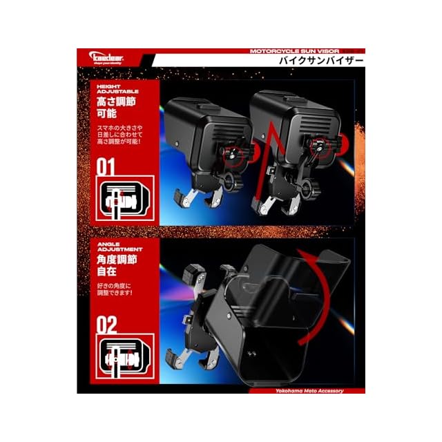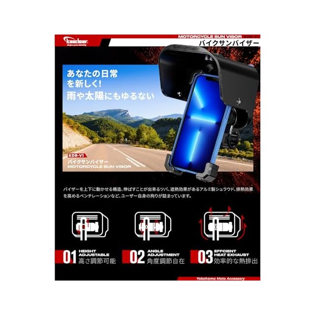 【日除けや雨除けとして】 夏のツーリングでは太陽光による熱の影響とスクリーンの明るさ最大状態による発熱により、 スマホの温度プロテクションが作動してスマホが使用できなくなります。 サンシェードで日陰を作り、画面の明るさを下げる事でスマホの温度上昇を軽減します。雨のツーリングではスマホのスクリーンに付着する雨粒により、画面操作ができなくなったり誤作動を引き起こします。サンバイザーが雨を避けスマホの操作性を維持します。 ご注意:⑴効果を発揮するために最低限必要なサイズとなります。思ったよりもサンバイザーが大きく、メーターが見えづらいなどの障害が発生する可能性があります。⑵重量が増すため、クランプバーの強度により振動で振れやすくなったり、折損する可能性があります。対応品番KDR-H3/KDR-H4W/KDR-HB1/KDR-HB2/KDR-HB2L/KDR-HB3/KDR-HB4、非対応:KDR-H3-2(振れやすい)/KDR-H4-2(重量超過)/KDR-H4-3(重量超過)/KDR-H4S(重量超過)。⑶別途マウントパーツが必要になる場合があります。