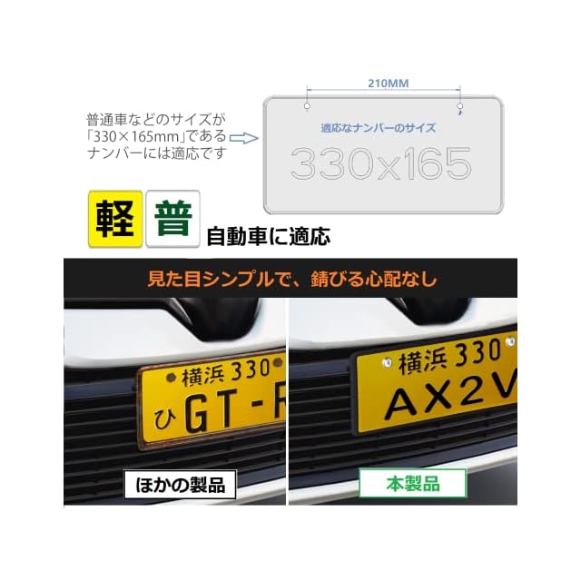 【適応なナンバー】:適応なナンバーのサイズはこちらです:「縦165 mm×横330 mm」。ご愛車のナンバーサイズは上記のサイズであれば、こちらのナンバープレートカバーは適応です。日本のほとんどの普通車、上記のナンバーサイズの軽自動車などには適応可能です