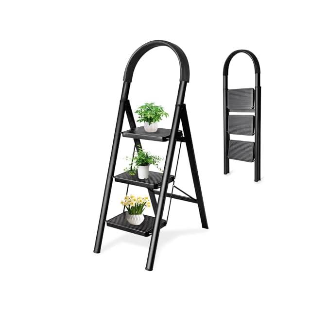 安全設計:手すり付きで安定感があり、滑り止め加工で安全な昇り降りをサポートします。滑り止めの足がしっかりと地面を捉え、安心して作業できます!特別な表面処理を施した踏板は、滑りにくい、雨の日でも安心して使用できます。