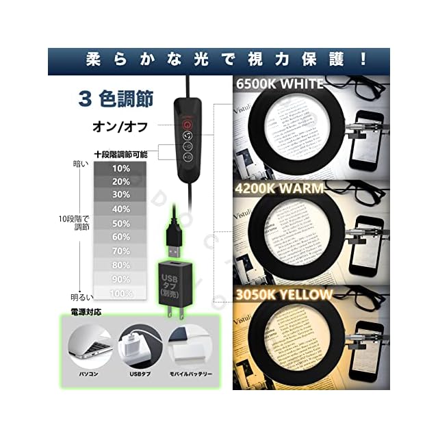 【調光】ボタンを押し、10%~100%輝度を調整できます。お好きな明度を楽に選べます。ライト色は3種色切り替え可能。6500K(冷色)、4200K(電球色)、3050K(暖色)。照明の需要を満たすことができる。さらにソフトライトは自然光に近い明るさで、長時間の仕事、勉強でも目が疲れにくいです。USB給電でUSBハブやパソコン(USBハブは別売です)、モバイルバッテリーにも対応できます。