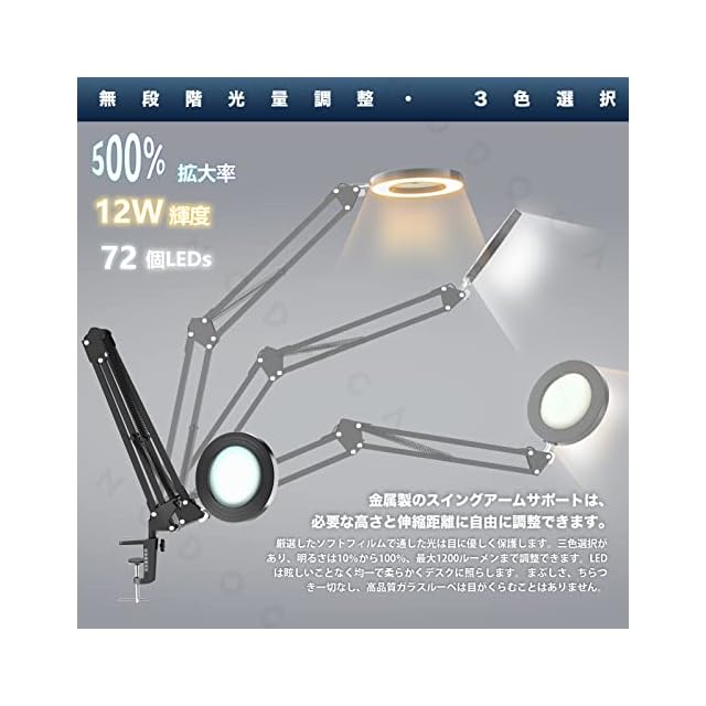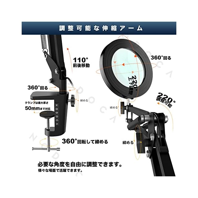 NODOCA 拡大鏡 スタンド ledライト付き 5倍の倍率ルーペスタンド クリップ式 卓上ルーペ 72個のled 拡大鏡 3色無段階調光 360°角度調整可能 USB給電 読書 作業用 手芸用 目に優しい 多用途 ブラック | つむぎ屋