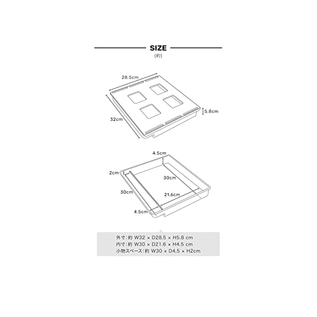【サイズ】外寸:幅 32cm × 奥行 28.5cm × 高さ 5.8cm 内寸(トレー):幅 30cm × 奥行 21.6cm × 高さ 4.5cm 小物スペース:約 W30 × D4.5 × H2cm 【カラー】オフホワイト