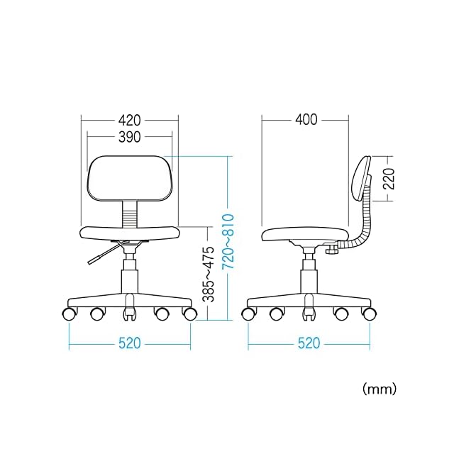 【背もたれサイズ】: W390×H220mm【座面サイズ(座面調節)】: W420×D400×H385~475mm