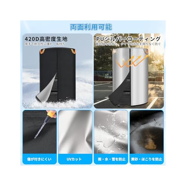 【高品質420D素材&両面利用可能】2024進化版タイヤカバーの表面は厚手で耐久性があり420Dオックスフォード生地で、裏面にはPU 防水・シルバーコーティング加工が施され、丈夫で破れにくく長時間使えます。このダブルフェイス設計により、天候や状況に応じて使用方法を選択できます。さらに、両面ファスナーを採用し、簡単に切り替えることができます。タイヤの保護性能が高く、屋内・屋外どちらに保管するにせよおすすめのタイヤカバーです。