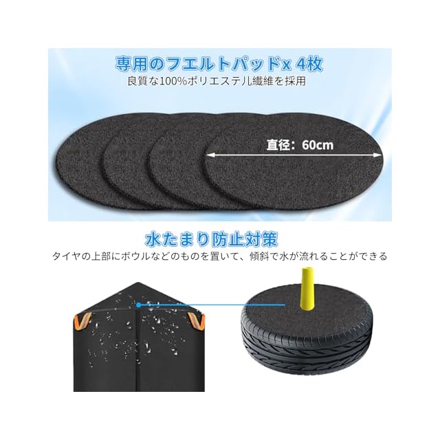 【夜間反射持ち手&大判フェルトパッド】屋外 タイヤカバー は使いやすさと夜間でも視認性を確保するために反射材付きの持ち手を備えて取り扱いがより手軽・安全に行えます。直径60cmの大判フェルトパッドが4枚付属しており、フェルトバッドをセットすることにより、タイヤの日常保管・ホコリ・傷防止・劣化防止・雨や汚れ・紫外線の対策に優れた保護効果を発揮します。