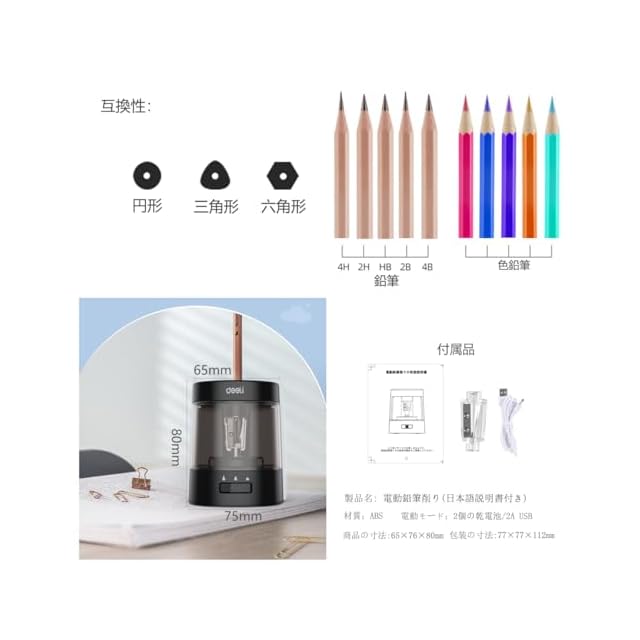 充電不可、6~8mmの直筆鉛筆に適しています。注:本品は内蔵式のバッテリーは搭載されていません。 単三電池(含まれていない)かUSB 2Aの電源が必要です。(USB 1A電源は使用できません)