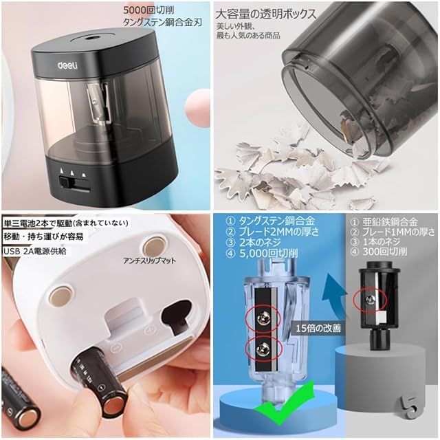 長寿命:替え刃取り出すことができます。使用回数を増えてきて、製品の寿命を延長することになります。 お得で環境にやさしい電動鉛筆削りです。