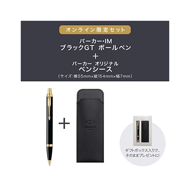 セット内容…「パーカー・IM」のボールペン、パーカー オリジナルのペンケース(素材:PU)、ギフトボックス(素材:紙)。