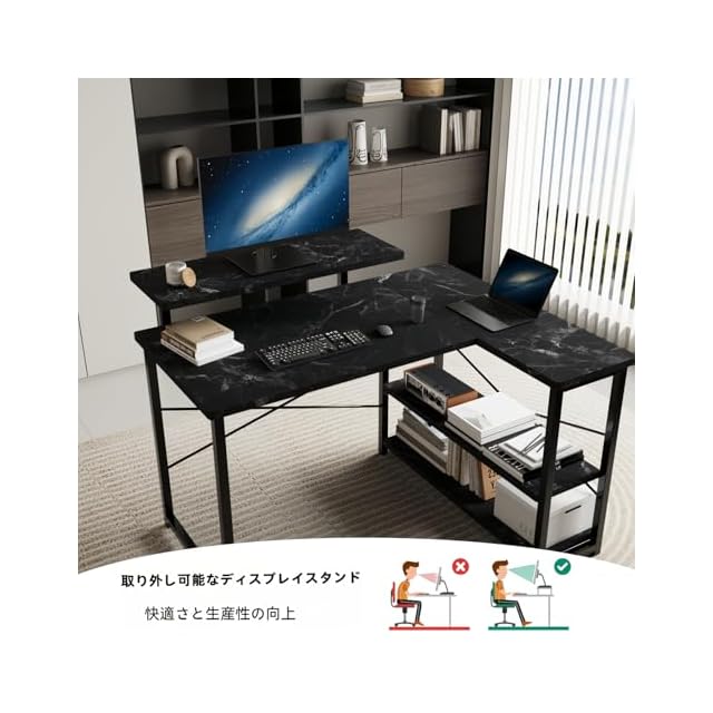 【ゲームと仕事両立】L字ゲーミングデスクは実用性が高く、ゲームプレイ、在宅勤務、書斎机、勉強机など様々なシーンで大活躍!モニター台を利用して目線をあげることで、作業時の姿勢を改善し、テレワークが快適になり、作業効率も格段に上がります。