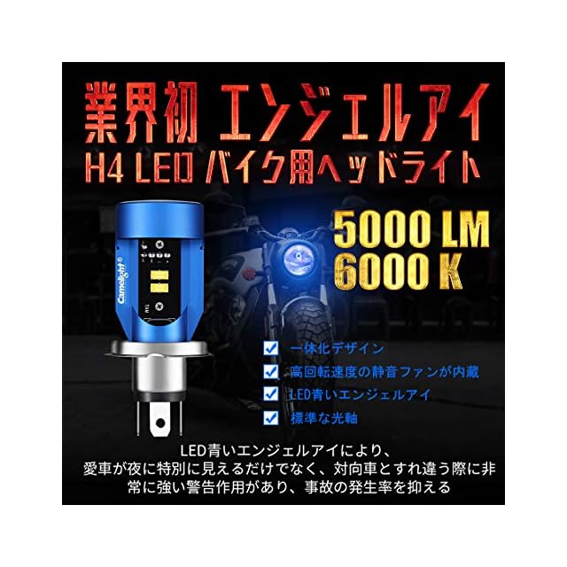 【高い品質】エンジェルアイを持つLEDバイク用ヘッドライトは特許を取得したCamelightの最新製品です。静音ファンを内蔵し、20000時間の使用寿命をします。一つ一つの製品は厳格な高温・低温の温度テストに合格しています。安心してご購入ください。LEDバイク用ヘッドライトの高密度なライトビームは、元々装備されているH4ハロゲンライトよりも強力な透過力を持ち、いっそう広い視野を確保。より安全にライディングできます。