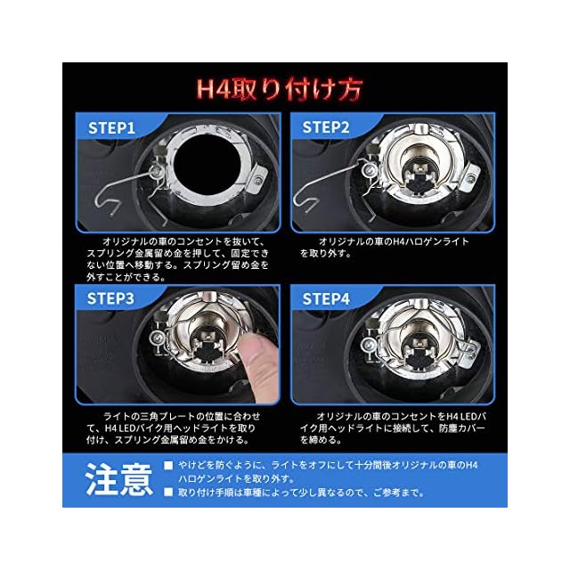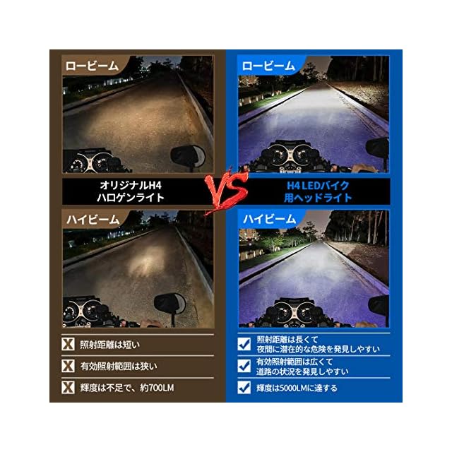 【高輝度、高効率】H4 バイク用ヘッドライトは2組の30W高効率CREEバルブを採用。明るさは5000LM。ハロゲンランプと比べると3倍以上の明るさです。また消費電力は50%。高効率で環境を保護します。LEDバイク用ヘッドライトは元々装備されているハロゲンライトと完全な互換性を保ち、かつライトの光が分散しません。