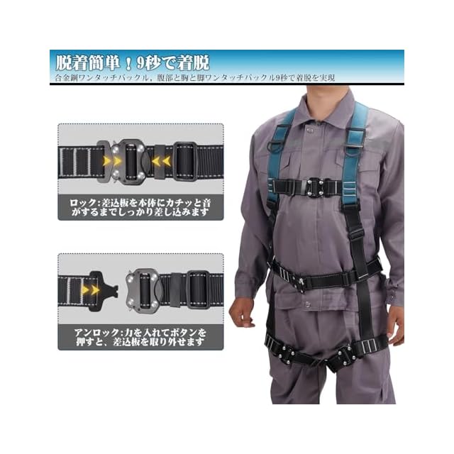 フルハーネス安全帯使用ヒント: 各部のサイズは調整できる、脱着カンタン。ショックアブソーバーはついていますので、一旦落下時墜落時、フルハーネスは衝撃を体全体に分散し。これにより、身体損傷を大幅に軽減できます
