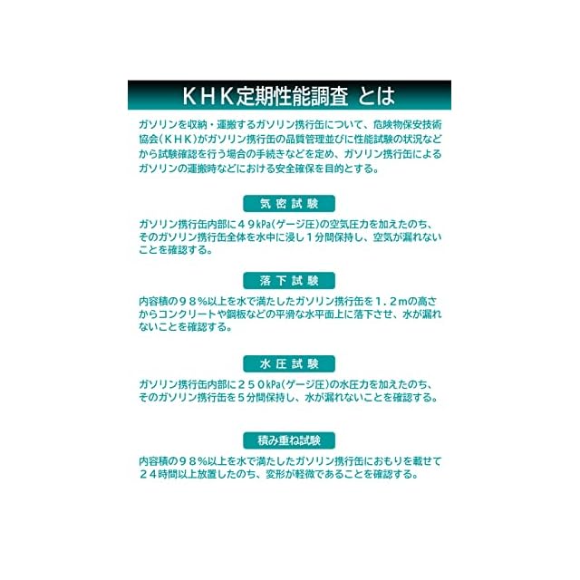 メルテック ガソリン携行缶 FZシリーズの強み:より安心安全に!消防法適合品・日本国内にてKHK(危険物保安技術協会)認定を取得!