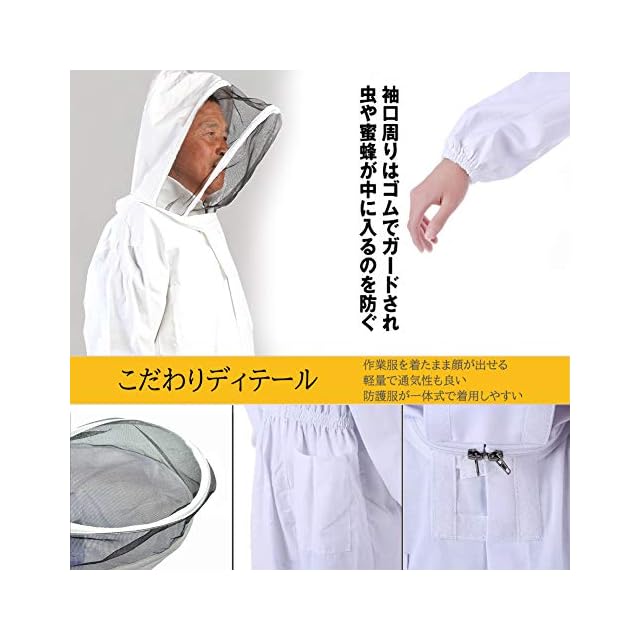 【こだわり】■フェイスネット:フェイス下のチャックがあり、服を着たまま顔が出せますし、途中での飲食も容易で便利です ■手首・足元をゴムでしっかりガードしており、虫や蜂の侵入を防ぎます。 ■顔面部分はメッシュ生地、ほかの部分は通気性も良く夏場の作業も快適です。 ■ウエスト部分には便利なポケットがあり、さまざまなアイテムが収納できます。 ■脱着がしやすくて便利です。
