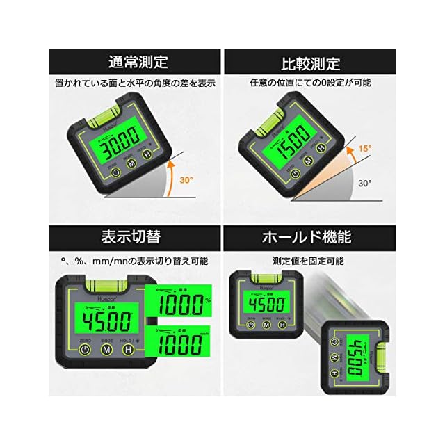 【機能が完備】任意の角度を基準点に設定の比較測定機能や、角度(°)・勾配(%)・立ち上がり(mm/ m)の表示切り替えや、見えにくい場所でデータを固定するホールド機能のほか、校正機能、低電力表示機能、自動電源オフ機能、数値反転機能など、必要な機能は網羅されています
