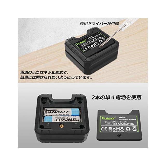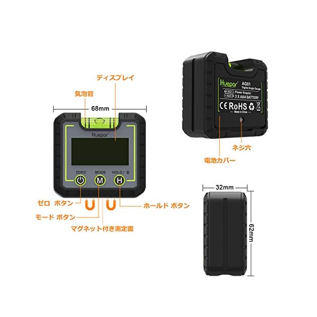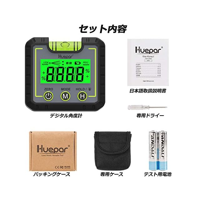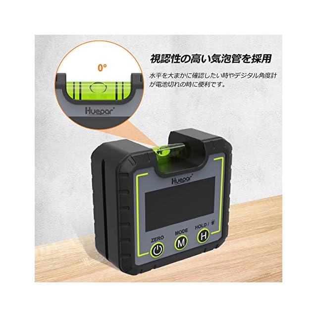 商品名:Huepar デジタル角度計 アングルメーター 傾斜計 デジタルレベル 水平器 レベルボックス バックライト付き マグネット付き 小型 ミニ 日本語取説付き AG01