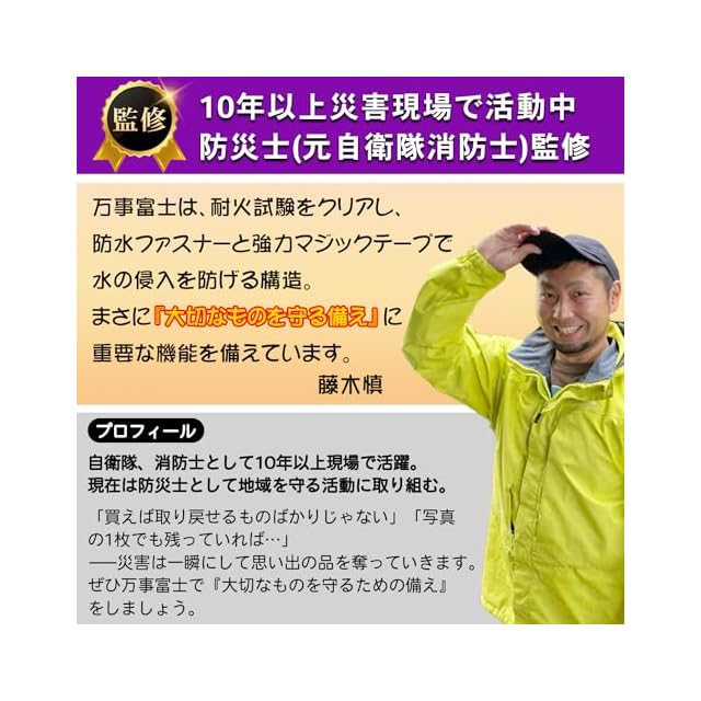 この防災バッグは、日本の検査機関で耐火試験を通過した信頼できる製品です。防水ファスナーと強力なマジックテープで、水に対する耐性も高いです。現役防災士の監修により、10年以上のプロの知識が込められています。内ポケット付きで大容量で、万一のときにも安心して使えます。日本ブランドで、365日の安心サポートがあります。サイズは38×27×8cmで、重さは0.38kgです。防水ファスナーと内ポケットが特徴で、寝具からジュエリーまで、様々なアイテムに対応しています。