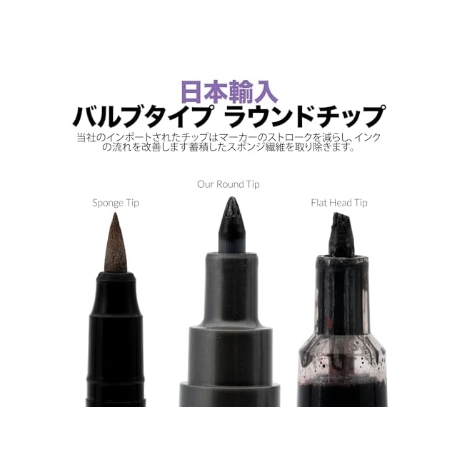 改良されたバルブタイプの丸型チップ:改良されたバルブタイプの丸型チップを搭載しており、滑らかなインクフローを確保し、マーカーストロークを減らし、スポンジ繊維の蓄積を防ぎ、毎回プロフェッショナルな仕上がりを実現します。