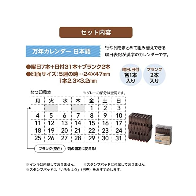【セット内容】ゴム印38本(曜日7本+日付31本)、ブランク2本